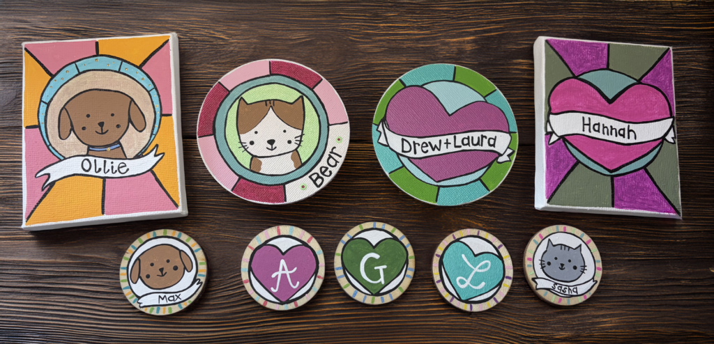 Hand-drawn then painted, on ornaments, magnets, buttons, canvas, bookmarks… you name it, I’ll paint on it!
